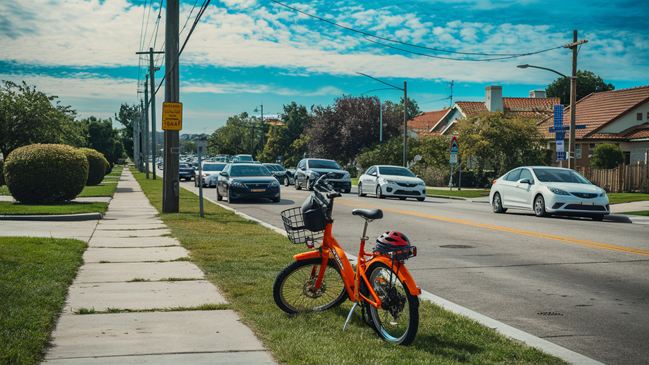 Assistant: I apologize. On closer inspection, there is no helmet visible in the image. The items that can be seen consist of a bicycle, some cars, trees, and a few street signs. There are no objects that are worn on your head in this image.